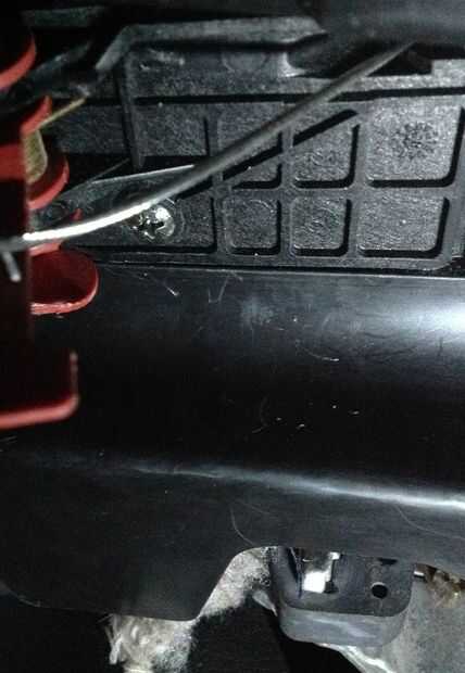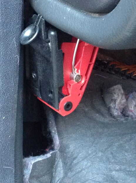 Empuje el asiento hacia atrás. Cajonera debajo de la pata bien con algo de luz y destornillar la palanca de liberación del capó.