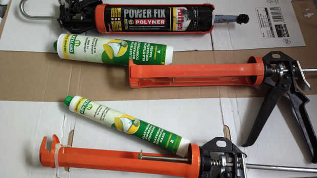 Si utiliza dos pistolas de calafateo separado como se muestra en la primera foto Asegúrese de Jale la manija hacia abajo cada vez para ambos compuestos se mezclan en las proporciones correctas. Para estabilizar el tubo de endurecedor (componente B) dentro de la pistola para calafatear, encontrar una moneda pequeña o redonda chito ligeramente más pequeño que el diámetro del tubo del componente B. Taladre un agujero en el disco y vuelva a colocar el disco de empuje existente. Un atador de cable en la parte frontal mantiene el tubo caiga hacia fuera.
