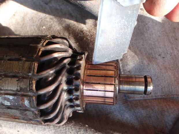 Eliminar cualquier corrosión con papel de lija mojado y seco, y el conmutador se puede lijar la parte posterior de un cuchillo de corte de caja se puede utilizar para limpiar entre los segmentos. El aislamiento entre los segmentos debe ser bajo corte para funcionar correctamente. Que un trapo aceitoso se utiliza para limpiar todo lo posible para ayudar a prevenir la corrosión futura.