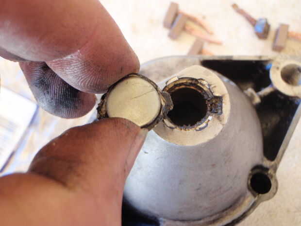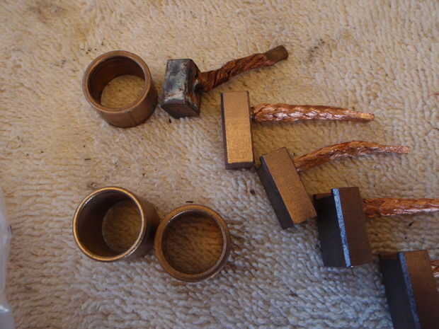 Después de la inspección y limpieza de todo lo que se decidió sólo reemplazar los cepillos y los arbustos. Los arbustos pueden eliminarse con el zócalo y un martillo. Bush en la nariz del arrancador tiene una tapa que puede ser cuidadosamente noqueada con una extensión de 1/4 unidad. Un poco de calor en la nariz de aleación le ayudará a eliminar el arbusto. 2 de los arbustos se prensan en y puede ser cuidadosamente termofijado y retirar el cepillo. Tomar las piezas y la placa de identificación en el devanado de campo y los vehículos de chasis a un taller eléctrico y deben ser capaces de emparejar los pares total coste debería ser alrededor $20-$30.