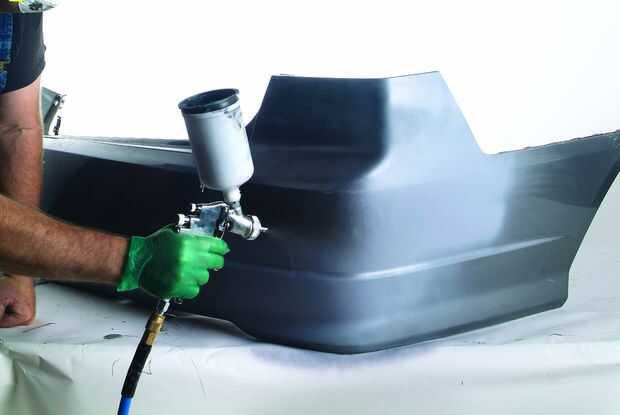 Una vez terminada la reparación, aplique dos capas mojadas de sellador flexible parte. Después de secar por 30 minutos, la fascia está lista para la imprimación y la pintura. Prime la defensa con dos manos de cualquier cartilla de dos partes, asegurándose de que deje secar entre capa y capa la imprimación. Una vez que ha endurecido la cartilla, seco lije las áreas reparadas con papel de grano 400 para nivelarlo y eliminar cualquier imperfección. Antes de rociar el parachoques con basecoat, wetsand él y limpie suavemente el área con un trapo de la tachuela para quitar el polvo, luego rocíe según las instrucciones del fabricante. Puede que necesite repetir este proceso dos o tres veces para cubrir completamente. Una vez seca la capa base (generalmente cerca de 30 minutos), mezcle la laca transparente con endurecedor. Se aplican dos barnices medio, permitiendo que cada una se seque en el medio. Después de secar durante la noche, la fascia está lista para ser reinstalado.