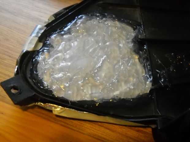 Terminé con un problema en quitar el molde. El papel de aluminio pegado al pegamento caliente, a pesar del agente desmoldante. No sé por qué esto sucedió. En el futuro proyectos, creo que voy a tratar de usar envolturas de plástico de tipo "Saran" en lugar de hoja. He encontrado para despegarse el pegamento plástico refrigerado incluso sin agente desmoldante, por lo que debería funcionar muy bien.