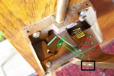 Este punto de vista mira hacia abajo en el mecanismo de arriba. Se ha eliminado la cubierta del mecanismo. Los dos agujeros superiores son visibles en el casting. El cuadrado negro rodea el orificio donde se inserta la llave hexagonal para bloquear y desbloquear el pánico mecanismo de la barra. El contorno verde es un thd especial 5/16 "x 18. tornillo de fijación con un extremo de la cúpula. Cuando la barra antipánico es empujada hacia la puerta, la porción de la barra en el mecanismo gira alrededor del eje que se indica por el círculo rojo en la dirección de la flecha roja (sentido antihorario). La cabeza abovedada del tornillo de fijación viene a alinear directamente opuesto a la línea azul pálida, que representa un punto plano en el marco del mecanismo donde la cabeza abovedada viene a descansar como el tornillo de fijación Gire a la derecha para extender en longitud. Las líneas amarillas representan un pesado resorte que hace difícil introducir el eje rodeado en rojo si se desmonta el mecanismo. Otra vez volver él todos juntos es un trabajo de dos hombres. Uno empuja contra el muelle mientras los otros insertos el eje. Incluso entonces no es fácil.
