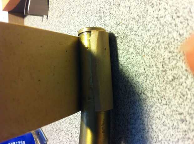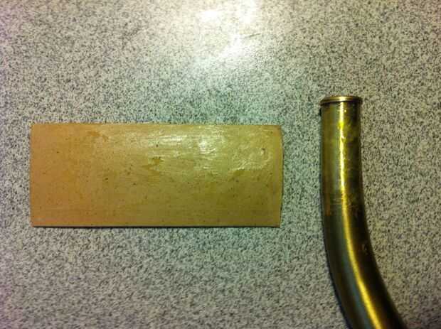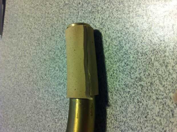 Algunos cuellos de saxofón tienen un pequeño labio de latón en el borde como se muestra (de mi saxofón Buffet), estos pueden ser difíciles de abrigo, así que tómate tu tiempo cuando hagas esta parte. Si el cuello no tiene el labio puede dejar un poco de corcho caída sobre ese borde y recortar fácilmente volver más adelante con una cuchilla de afeitar.