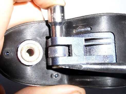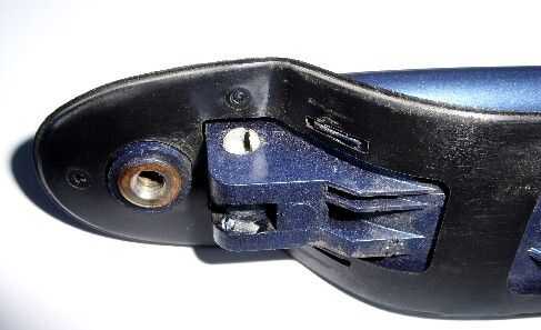 El otro extremo de la manija gira en un remache plástico. Use el pequeño zócalo para empujar las tres lengüetas del remache en y hacia abajo simultáneamente. Utilice el destornillador de cabeza plana para apalancar lo suficiente como para eliminar. El mango será ahora de sacarla de la Asamblea.