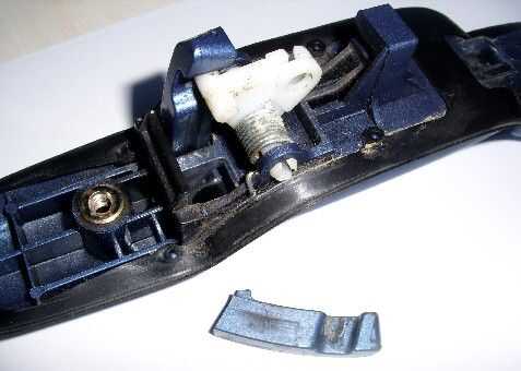 El mango tiene dos dedos que se ajuste alrededor de la pieza de plástico blanco para abrir la puerta. Uno de estos dedos había interrumpido. Me encontré con ese pedazo dentro de la puerta (un espejo, la linterna y el grabber flexible vinieron en prácticos aquí).