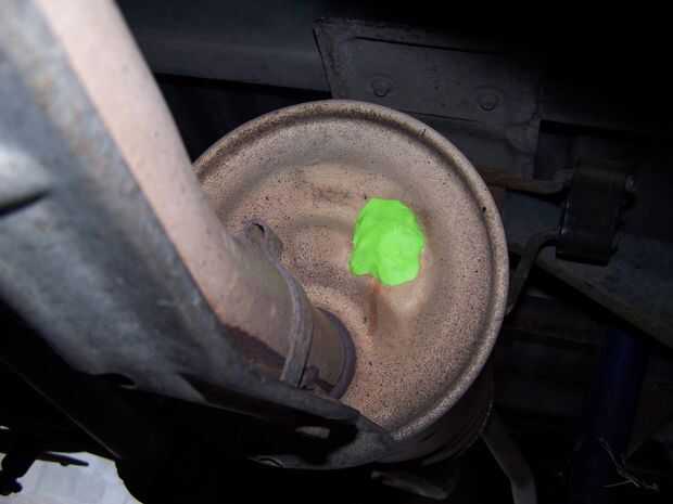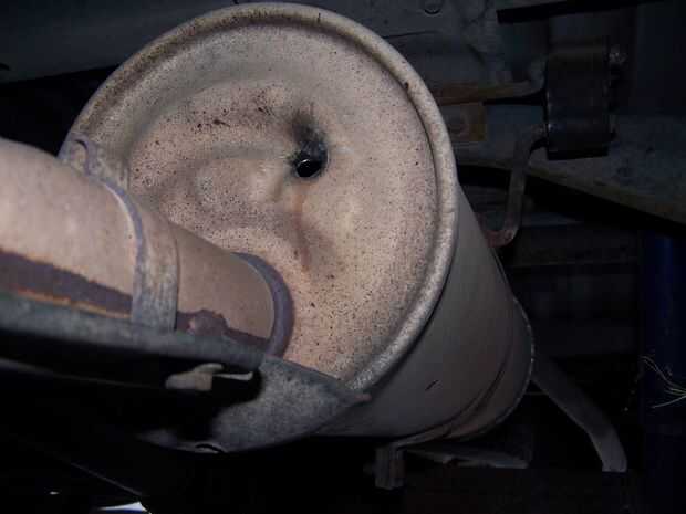 Nuestra pequeña camioneta falló la prueba de emisiones. El técnico de smog dijo que no había ninguna presión a la salida del tubo de escape. Indicaba que había una fuga en el sistema de escape. Cuando finalmente consiguió a inspeccionar el escape de fontanería lo behold, había un agujero en el silenciador! Fui a la tienda de autopartes y encuentra un producto que venden para las reparaciones de escape. Incluye una pasta química para aplicarse a la zona a reparar. Ya que no soy demasiado aficionado a usar/tocar productos químicos; Pensé ¿qué es otra forma de reparar este agujero en el silenciador? Entonces me di cuenta que el agujero puede ser conectado. He buscado a través de mi cubo de hardware y encontró un buen conector metálico. Con un poco de grasa de codo la encajara perfectamente en el silenciador. Además tuve algunos arcilla del polímero no tóxico que había usado en otro proyecto. Limpié el área alrededor de la clavija y aplicado esta arcilla para completar esta reparación. No hace falta decirlo, nuestro camión pasa la prueba de emisiones después de esta reparación!
