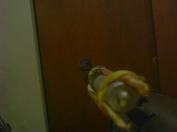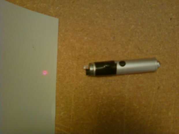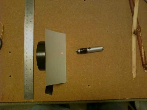 2. Coloque 2 pegar en los lados opuestos del puntero láser para que el punto donde sale el laser es equidistante de ambos palos
