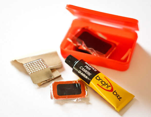 El kit de reparación está compuesto por algunos parches (probablemente de diferentes tamaños), algunas herramientas scratch (papel de lija o un pequeño rallador de metal), tubo un poco de masilla (un tipo de pegamento) y tal vez algunos pequeños tubos de goma para extender la masilla.