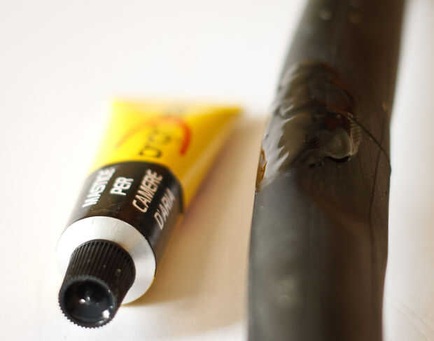 Use una capa fina de pegamento. Más no es mejor y si es frío tardará mucho más en curar. Si demasiado mucho sale uso los tubos de goma en el kit de reparación para difundir hacia fuera.