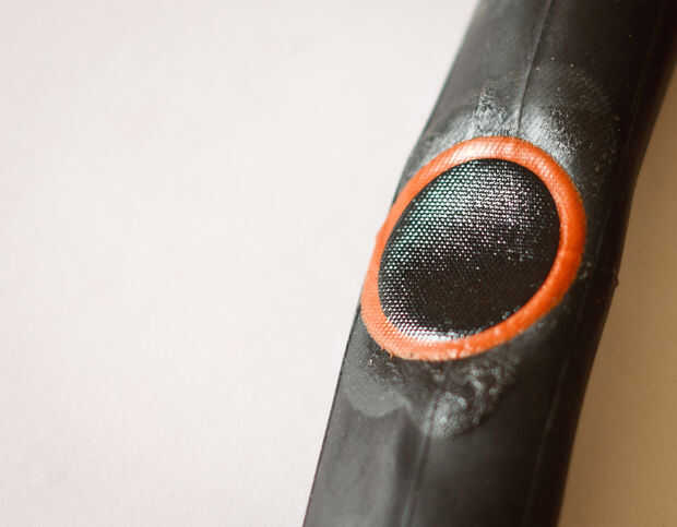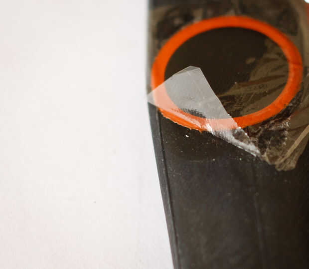 Para eliminar la hoja fina de plástico, hay que mantener abajo la frontera de parche rojo con la uña. No es un gran problema si la frontera se desprende, de todas formas prueba a dejarlo pegado. Si no suelta la capa plástica de la parte superior del parche, dejarlo ser, cuando 60 psi lo empuja contra la parte interior del neumático, no va a hacer ninguna diferencia.
