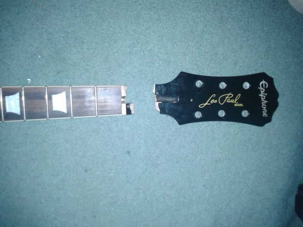 Así que de alguna manera has conseguido romper la cabeza de la guitarra Limpie el cuello. Con esto en mente, es probablemente un diseño de Gibson/Epiphone con la cabeza muy inclinada y probablemente la soltó. Puede encolar y fijarlo con la abrazadera buena como nueva, tal vez la parte que se rompió para que coincida con la pintura. Eso está bien.