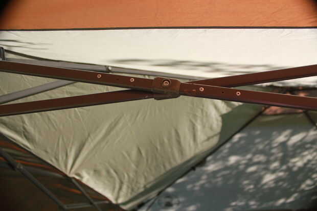 estaba en la buena voluntad y encontrar un toldo instantáneo Coleman 13 x 13' por sólo unos dólares porque uno de los tubos de soporte se rompió por la mitad.  El tubo de soporte corrió diagonalmente de una de las patas de esquina a la mitad del lado de la tienda.  El tubo se rompió justo en el punto donde el tornillo pasa a través para conectar a un segundo tubo para que la carpa se pliega estilo tijera para cerrar.