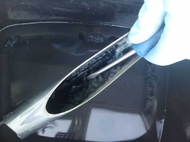 6. cuando haya terminado de quitar el elastómero, todavía habrá algunos pequeños pedacitos de elastómero restante. Utilizar la lija de 80 grano para moler estas lejos. (Una manera más rápida es utilizar una broca de taladro de la rueda de la aleta. Tendrá un diámetro uno con una caña larga para obtener todo el camino dentro de la manga.)