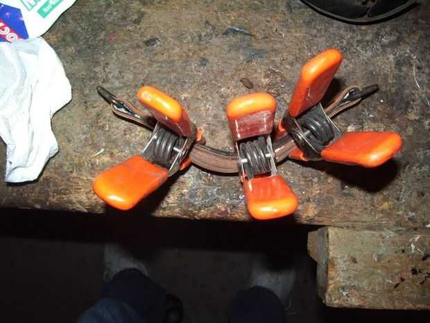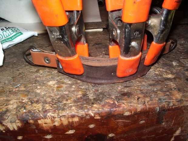 A continuación pega la correa nueva a las otras partes de la manija interna y afianzado con abrazadera hasta que el pegamento seca. Prácticamente cualquier pegamento que se adhieren al cuero trabajará para ello, sólo se utiliza el pegamento para mantener las piezas juntas para volver a cubrir. Usé un pegamento a base de silicona, pero sólo porque un tubo estaba a mano. Pegamento blanco habría funcionado igual de bien para esto.