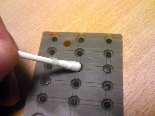 Debemos limpiar en seco la membrana y el circuito impreso. Esto se puede hacer con si de alcohol o relacionados pero no son de muy buena calidad pueden dejar residuos secos al Magan y no lo recomiendo. Hemos de prestar atención al limpiar la membrana por debajo.