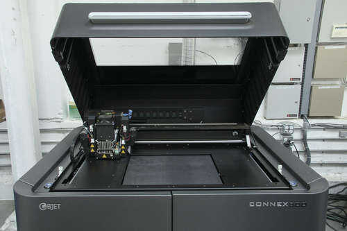 También he podido imprimir mi modelo en una impresora 3D extremadamente High-End llamada el Connex 300 por Objet. Estas funcionan con boquillas de chorro de tinta-como que depositan capas de gotas de resina de plástico muy pequeñas que son curadas con luz UV. Estas impresoras cuestan cerca de 100 veces más que los $1750 Makerbot Replicator y tienen por lo menos 10 veces mayor precisión. El material que el objeto utiliza costos cerca de 20 veces más que el ABS y el PLA Makerbots uso, pero el objeto puede mezclar materiales duros y blandos para producir objetos con exactamente la rigidez y la flexibilidad que usted desea.