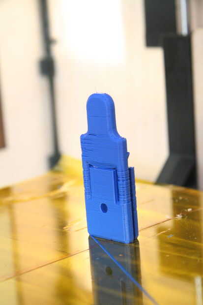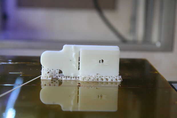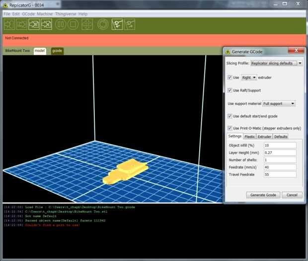 Es importante colocar correctamente la parte en la plataforma virtual de la construcción. Con ReplicatorG, tienes la opción de agregar material de apoyo, lo que permite imprimir piezas colgantes. Utilicé este porque me dejó imprimir una orientación que era mucho más estructural sonido.