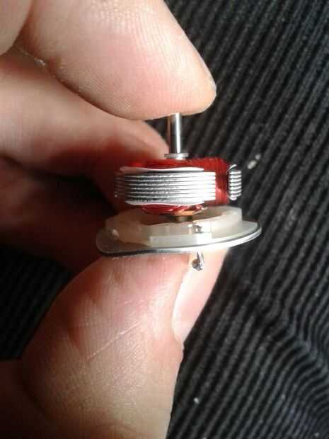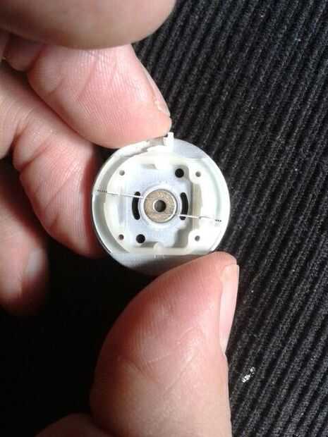 recientemente haber racionalizado mi pila de unidades de cd de rescate en partes útiles pensé abra uno de los motores pequeños para arriba para mostrar los intervalos de pequeños motores de cepillado son similares. Este uno (son realmente fotos de 2 diferentes motores aquí uno con cables conectados uno que fue soldado a un pcb) funcionó el mecanismo de la bandeja. La placa fue estacada en (el caso es presionado lo suficiente dejar salir y mover) tuvo trabajo cuidado con un par de cortadores pequeños de deshacer. Entonces inserta un destornillador pequeño en lo que es el puerto del cable en la versión por cable y trenzado para quitar la placa trasera. Esto no sólo doblado la placa trasera pero también dañan los imanes de campo (que parece estar la tira flexible utilizada en tarjetas de pantalla magnética) como he insertado el destornillador más allá del caso. En este caso, los cepillos son alambres bien que esto significaba que el conjunto de armadura tiene que insertarse en la placa trasera antes de volver a armar el caso. su posición revisado y ajustado con una aguja de coser. Una vez vuelto a montar la placa trasera estaba presionado back en lugar usando alicates de punta larga y un alfiler como una tuerca pequeña o una pila de arandelas habría hecho en su lugar. Esto también straightend la placa trasera y el motor sigue siendo funcional a pesar de los daños causados en el desmantelamiento.