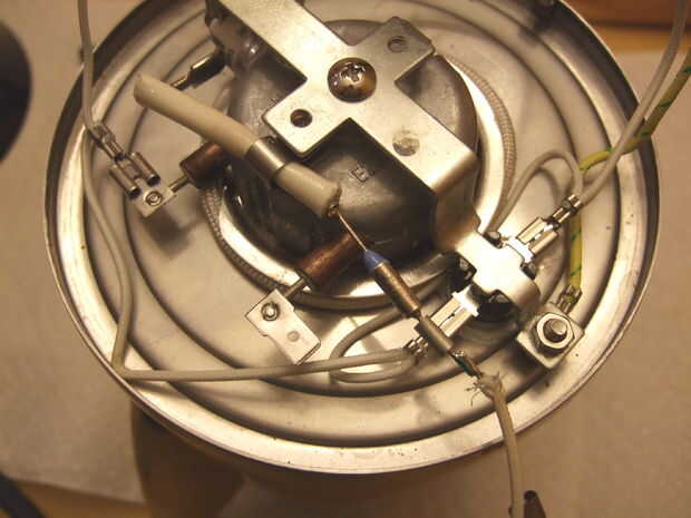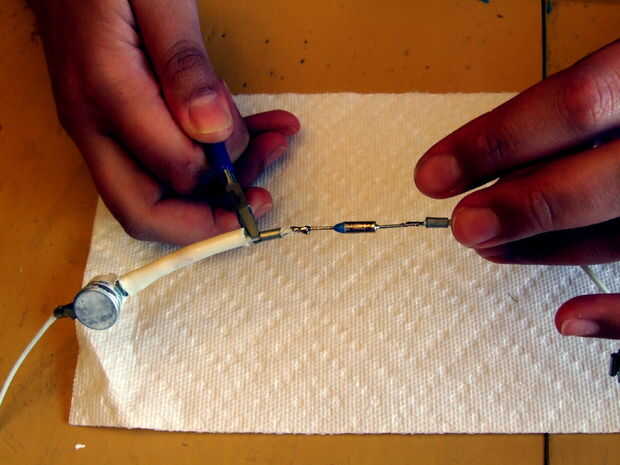A continuación, el atajo termal fue soldado en los cables. Lea las instrucciones sobre cómo conectar el atajo termal. Requiere que una cierta longitud de conductores dejarse recto, para no molestar el sello epoxy. Además, requiere el uso de un disipador de calor mientras se suelda. Esto puede lograrse mediante el uso de un par de pinzas entre el atajo termal y el área ser soldado (para que el calor entrará los alicates grandes y no dañar el sello de epoxy).