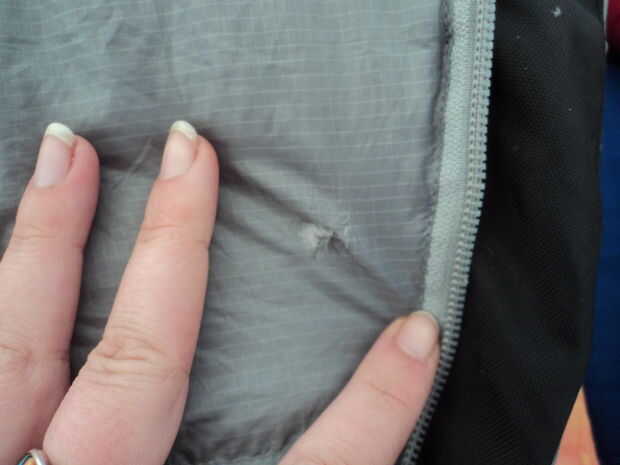 Si tienes plumas volando fuera de su bolsa de dormir, esto puede ser más difícil. Afortunadamente, fui capaz de arreglar la lágrima a la derecha después de que sucedió, para no tener que pasar horas peinando sobre cada pulgada de mi saco de dormir. He tenido que hacer eso antes y es un dolor enorme. Empujar muchas plumas vuelta dentro de posible y luego suavizar tantas arrugas como sea posible.
