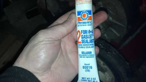 La única solución era hacer una junta nueva o encontrar una manera de sellar las mismas. Pensé acerca del uso de algún tipo de sellador, pero que no soportar el calor o la gasolina. Alguien en un foro recomendado Permatex 2 forma-A-Gasket para sellar y reconstruir las juntas. Promesas formar un sello químico y resistente al calor que no endurece con el tiempo. He comprado un tubo de 2 de Permatex en un auto de tienda por $4 la noche antes de una tormenta de nieve gigante, con la esperanza de que podría conseguir esta cosa corriendo esa noche.