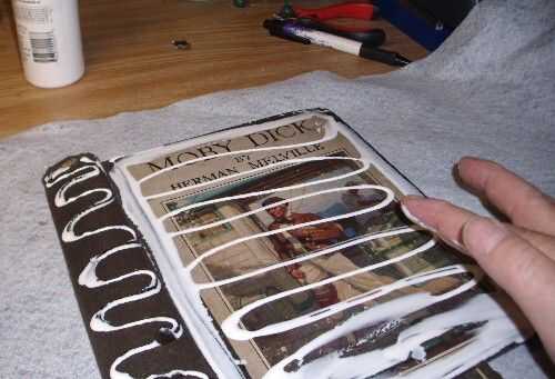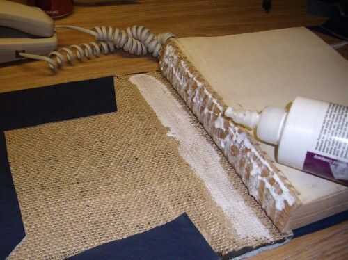 decidí volver a usar la cubierta de libro porque es del tamaño correcto y salió gran.  Solo pegué la tapa cara abajo sobre la tela nueva. Me corte las esquinas de la tela y doblado/pegué tal como se muestra en las fotos aquí.  He añadido el revestimiento interno de arpillera a la columna de páginas algo adhiera a.