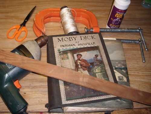 Necesita unos elementos comunes para su libro.  Usé algunos gigante abrazaderas tipo "C".  Trabajaron muy bien pero creo que un pequeño conjunto de abrazaderas podría funcionar mejor.  La próxima vez que lo hago, voy a tratar algunas abrazaderas "apriete" que parecen grandes clips.  Como ellos son lo suficientemente grandes para sostener el libro, deben trabajar.   Utilicé un hilo resistente y aguja grande.  Todo lo que es fuerte funciona ok cuerda de cometa o hilo de tapicería funciona ok. Pero no use hilo regular. Es demasiado fina para este propósito.   He comprado cola PVA. El PVA es poli acetato de vinilo.  Es un pegamento SIMILAR a blanco pegamento "Elmers". Es un adhesivo de calidad superior tiene más flexibilidad y más TACKYNESS y es libre de ácido para proteger el papel de libros.  No sustituya otras colas porque debe utilizar un pegamento que es FLEXIBLE y muy pegajoso.  Usted necesitará unos listones de madera finos como la colocación en la parte superior del libro.  Esto se utilizará como un ayudante de perforación.  También se necesitan tijeras y un motor de taladro eléctrico con broca pequeña (1/8 pulgada).  TAMBIÉN es necesario, pero no en la foto es alguna tela de tapicería de vinilo.  Compré el más barato bueno porque es más delgado y más flexible.  También se podría utilizar cualquier material de tela resistente viejo que crees que se vería bien en el libro.  Además, utilicé un pequeño pedazo de arpillera material debido a su tejido suelto ayudaría a sostener la cola.