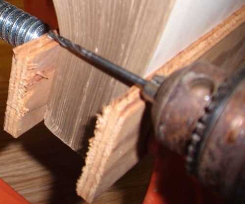 Configurar mi broca en el "portabrocas" para que la broca no se salga por el otro lado de la Junta.  Esto es algo importante para la seguridad.  Si permite que la broca salir al otro lado, debe ser muy cuidado de no perforar los dedos!!!!!!  No me gusta hacer en mis dedos, así que hice esto no sucedería utilizando este sencillo Consejo.  Por favor leer atentamente esta imagen.  NO estoy mostrando dónde perforar en esta foto.  Estoy mostrando que la longitud de pedacitos de taladro no va a penetrar la madera!!!! Cuando inicie la perforación, taladrará cerca de las espinas del borde, no forma aquí, donde la broca está en esta foto.