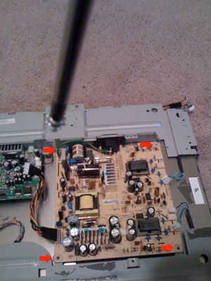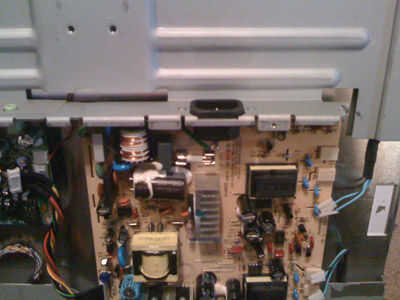 Establecer otra vez la pantalla y quitar los 4 tornillos que fijan a la carcasa. Preste especial atención al tornillo de la esquina superior izquierda. Éste es más grande y conecta la tierra con el chasis metálico. Muy importante!