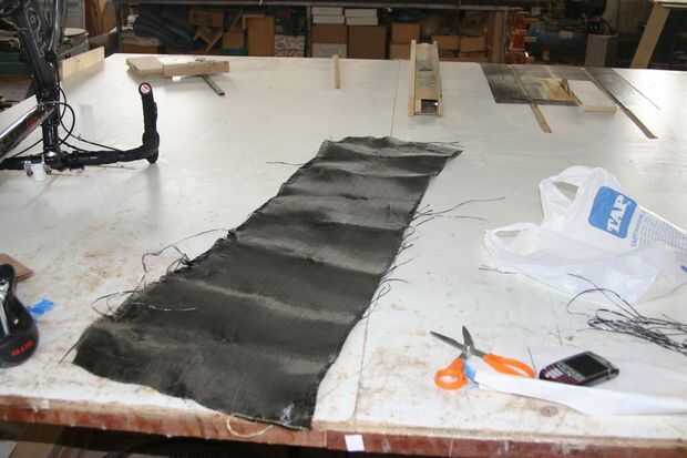 Aquí está la fibra de carbono. Es alrededor de $45 por yarda pero el chico de la tienda de epoxy estaba dispuesto a venderme un pie de $15. Que es todavía aproximadamente 20 veces más de lo necesario.