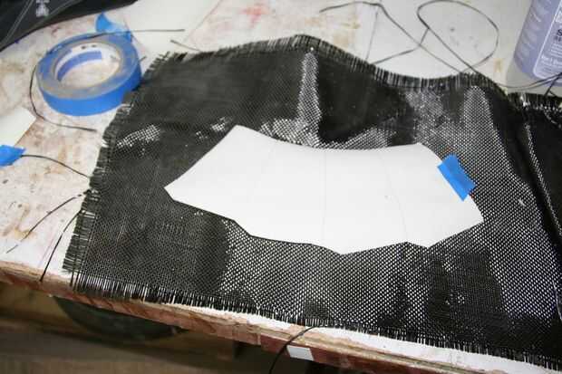 Lo que está sucediendo aquí es que voy a cortar un pedazo de tela que es de la misma forma compleja que esa plantilla de cartón blanco. La tela va a ser impregnado en epoxy y luego envuelve cuatro veces alrededor del tubo del armazón, que cubre el agujero.