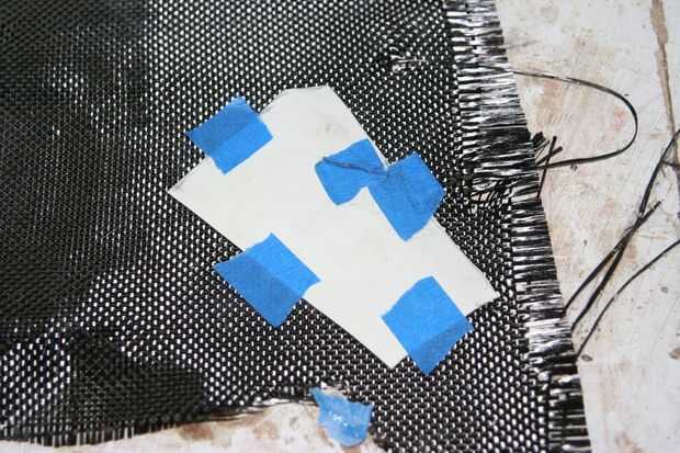 Esta vez estamos poniendo en la parte superior, capa externa que será visible para el resto de la vida de la moto. Así que tengo que tener cuidado para obtener el patrón de tejido en la tela para que coincida con la dirección del patrón de la armadura de la fibra original de la estructura. Tela de fibra de carbono parece venir en una gran variedad de tejidos y no parecía fácilmente posible emparejar los tamaños exactos de urdimbre y trama y patrón y textura. Pero todavía podemos llegar bastante cerca. Y por lo menos la dirección de la armadura.