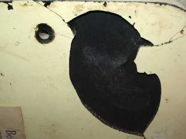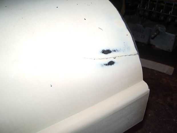 En la foto 1 se puede ver que esta casa de radio tenía cientos de astillas y grietas en él.  La grieta en la 1 º foto fue hasta el borde inferior, luego en la parte inferior (Foto 2) a una gran parte de la falta de vivienda (Foto 3).  Hubo muchas otras grietas, así como la larga grieta en la foto 4.  Obviamente esta radio se cayó en algún momento en el tiempo.