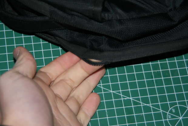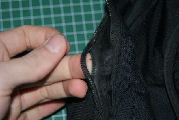 Mira la siguiente foto lo que ves, sí una cremallera rota. La cremallera no está unida a la tela ya. Esto sucede muy a menudo (al menos para mí). El hilo de la cremallera se desprende considerando apagado después de un tiempo y la cremallera.