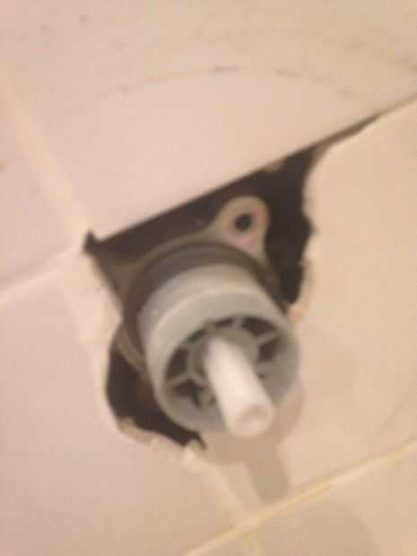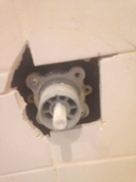 OK ahora con mi mina, he tenido que quitar algunos azulejos de alrededor de la llave por lo que he podido conseguir las piezas hacia fuera. He utilizado una dremel con punta de corte de azulejo y zumbó sólo fuera suficiente para que pudiera llegar a las piezas que necesitaba. El aro debe de izquierda un contorno en el azulejo, para que pueda ver donde puede cortar y no tiene que preocuparse de tener gaping agujeros en su azulejo.