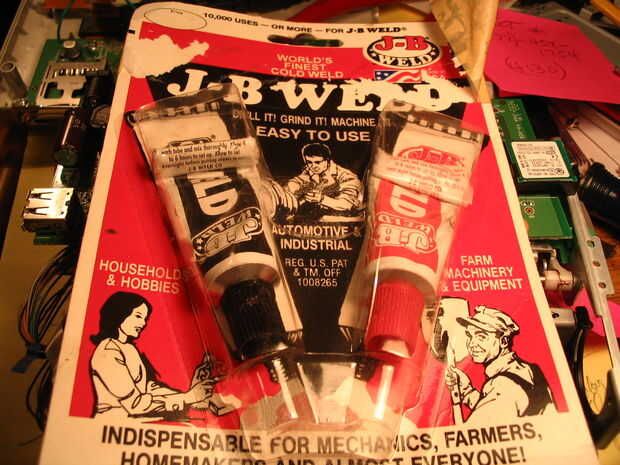 Mezclar cuidadosamente un lote de frescas JB Weld. (Probablemente otros marcas de epoxy probablemente funcionará, pero JB a mi me funciono). Utilicé dos clips de papel de gran tamaño (Gem)--para mezclar, y uno parcialmente enderezado, para aplicarlo.