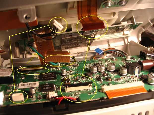 Refiriéndose a la foto, señalan los elementos en un círculo los dos cinta cables y conectores y un conector que debe ser liberada antes de puede ir más allá. La foto muestra que la tapa abierta es mucho más que posible antes de que los cables están desenchufados.