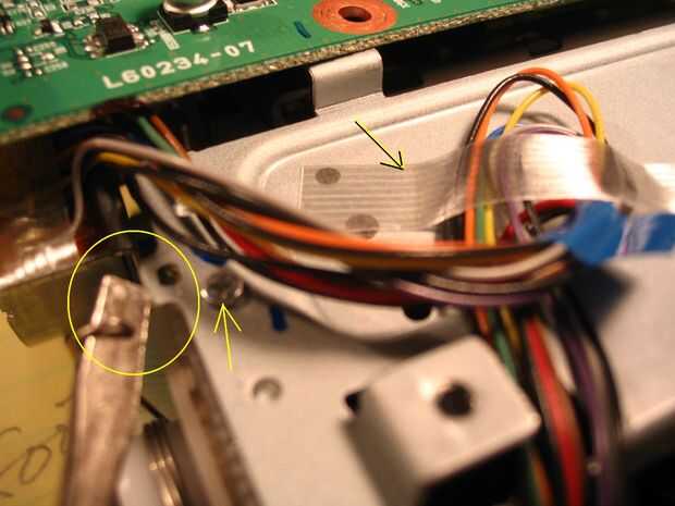 Para terminar este paso, tire suavemente de la cinta que sujeta los cables (flecha amarilla y negra) de la caja de metal. Deje la cinta conectada a los cables, que utilizaremos para volver a bloquear los cables cuando estamos vuelva a montar la máquina.