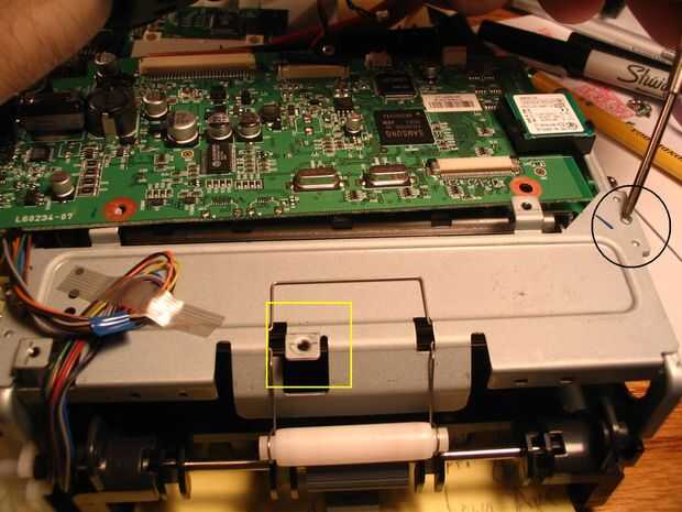 Por cierto, en el cuadro amarillo en el centro de la foto es el screwhole para el terminal de tornillo del cable verde mencionado anteriormente. Es mucho más fácil de ver aquí.
