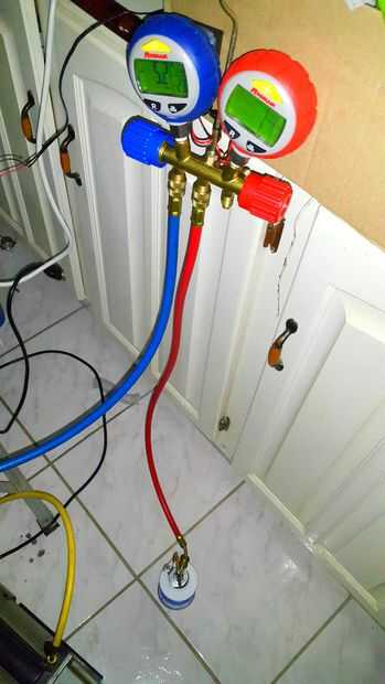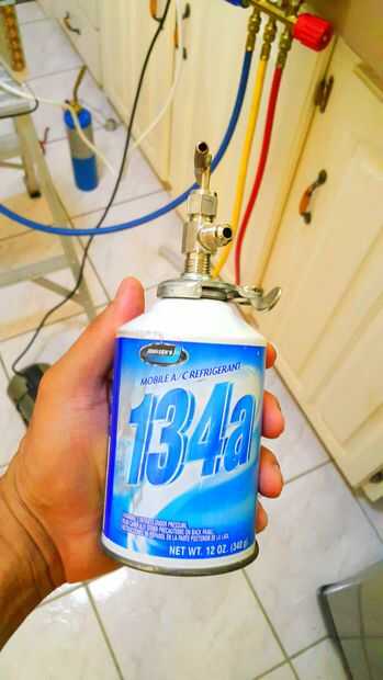 tenía una botella de repuesto de trabajo coche que hice así que puse un poco en el sistema de aspirado. Calculo alrededor de 1oz que necesitaba para un sistema tan pequeño pero tengo ninguna escala así que añadido pequeños volúmenes y observar el manómetro de baja presión.