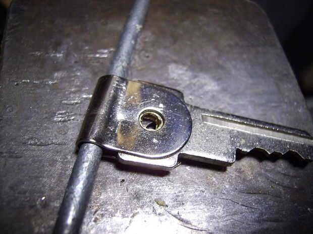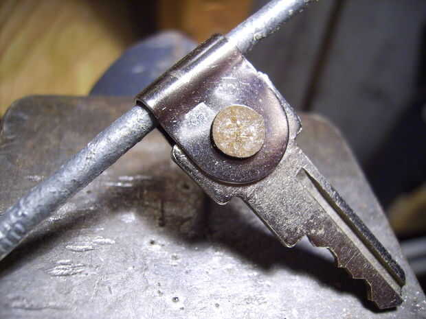 Ahora encontrar un clavo que quepa por el orificio y tiene una cabeza bastante grande para solaparlo. No quiere que caiga. Ponerlo en como yo lo he hecho y cortar el extremo puntiagudo con un cortador de alambre. Cualquiera va a hacer. Asegúrese de que dejar salir un poco. Mina que corte un poco más corto de lo que me hubiera gustado, pero todavía funcionó.