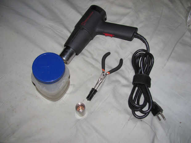 Tomar la base hacia fuera, sacuda el exceso mineral espíritus y Voltéela boca abajo en el concreto. De calor con un secador de pelo o pistola de calor hasta que empiece a instiga o el cromo comienza a decolorar. La idea es calentar todo lentamente y uniformemente para que el latón ampliará y separar el enchufe dentro.