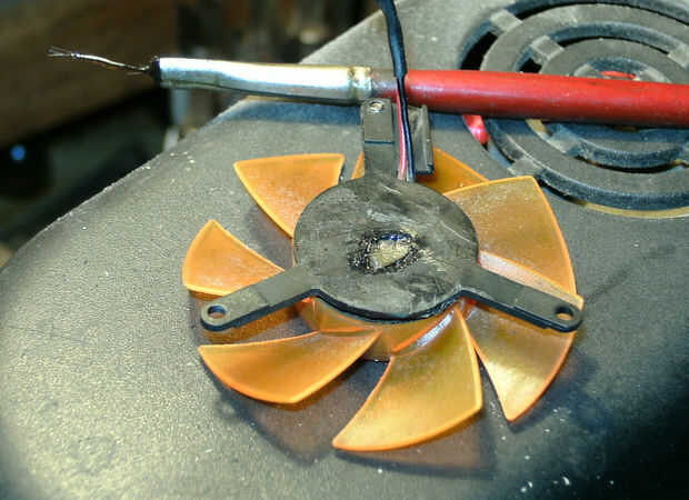 OK ahora tengo este lío de aceite sentado en un agujero en mi marco de ventilador. No quiero esas cosas corriendo por todo mi tablero de adaptador de vídeo limpio. Es hora de soltar esos dos pequeños triángulos de tela de algodón en allí, para absorber el aceite. Eso embalaje de algodón todavía permitirá el aceite para el cojinete. Es especie de un yacimiento de petróleo, para mantener los rodamientos lubricados con aceite.
