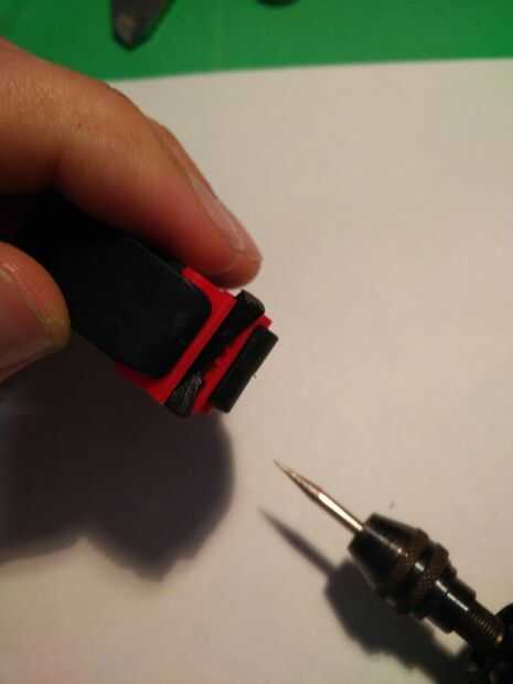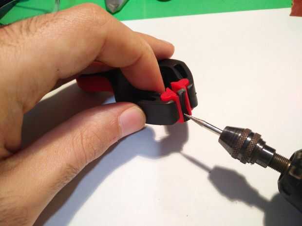 En el interior de la estructura hay un corte en forma de V, para todavía mantener la lente en la posición. Usé la Dremel para reproducir esta forma en el interior de la pieza impresa.