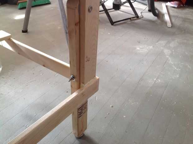 Sujete las patas a la mesa para que tengan espacio para doblar. Utilice el agujero en la pierna como un piloto para la perforación del agujero de perno de pivote. Coloque un tornillo de transporte desde el exterior a través de la estructura, una arandela plana para el espaciado y la pierna con la otra arandela plana. Terminar con una nuez de su elección, mi sugerencia es una tuerca con una función de bloqueo o Locktight. Una vez que tengas la pierna atada, perforar un segundo agujero cerca de la parte inferior soporte marco 90 grados del perno de otros (ver en foto de arriba que los pernos de la pierna 90 grados entre sí) a lo largo ancho de la pierna. Esto actuará como el accesorio anti-plegable. Utilice un tornillo del carro desde el exterior, sino el centro de la arandela no es necesaria y la tuerca puede ser una tuerca de mariposa. Hacer el agujero a través de la pata más grande para que sea más fácil de quitar para el almacenamiento.