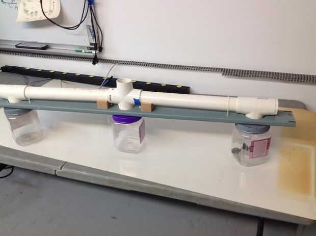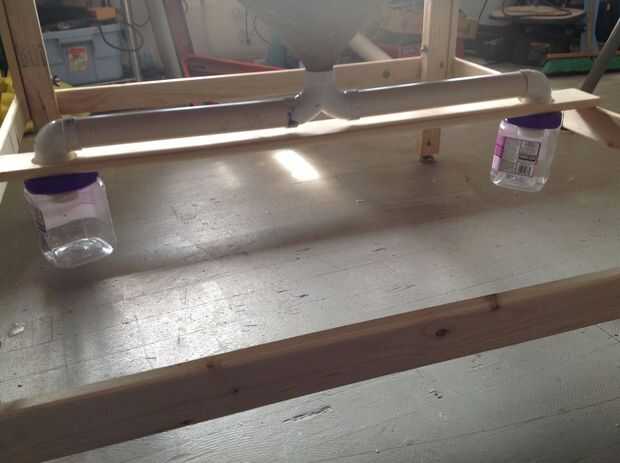 Esto fue una ocurrencia tardía. Usé 1-½" accesorios de pvc y tres jarras de plástico del caramelo para construir un conducto de captura para que los mármoles están dirigidos hacia el exterior de la unidad. El diseño original utiliza un balde de 5 galones en el centro. En el centro es un accesorio de PVC Cruz (utilizado para la ventilación de las líneas de desagüe). En el centro coloqué tres ⅛"latón barras espaciadas sobre anillado" aparte. Dobló la media más alta así que las bolas se dirigió a los lados y monedas podrían descender a través de. Se trata de cerca de 90% efectivo. Tuve que hacer un montón de experimentación para conseguir que funcione. Para facilitar el acceso para mermeladas, los extremos exteriores son estándar "T" con el final extra conectado con un conector de adaptador de 1-½ a ¾"(no pegado). El tablero de soporte es un 1 x 4 con tres agujeros perforados a través de las piezas de PVC. I montar las tapas de los tarros de caramelos en el tablero primero y luego perforados a través de la tapa y luego la madera. Os adjunto la tabla en ambos extremos con ¼" pernos moruna e hilo inserta en el marco lateral. Tuve que aliviar el borde superior del marco para proporcionar suficiente espacio cuando agregué la función de moneda.