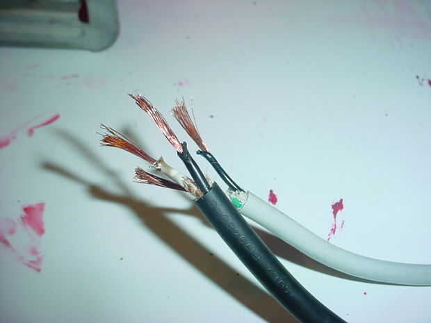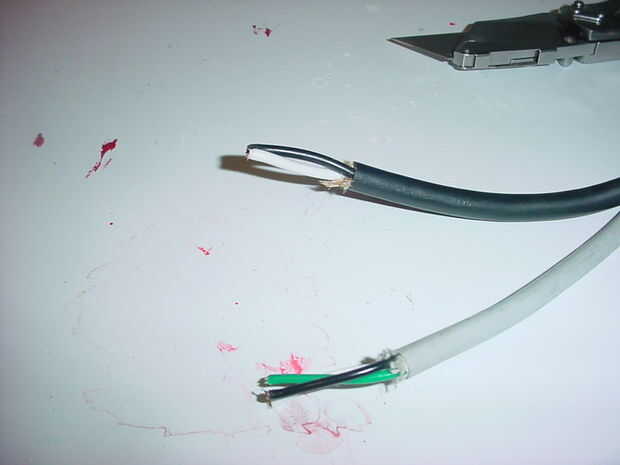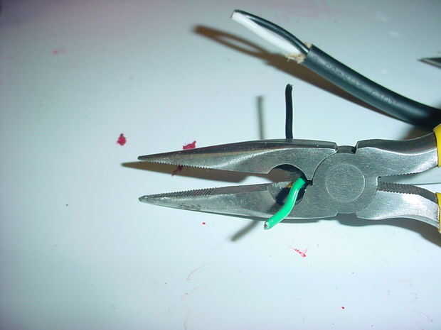 limpiar los extremos de ambos cables, tira hacia atrás la cubierta de outter, retire el cable verde de tierra y quite la parte superior una pulgada o tan de aislamiento dejando los cables pelados