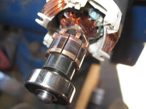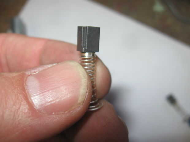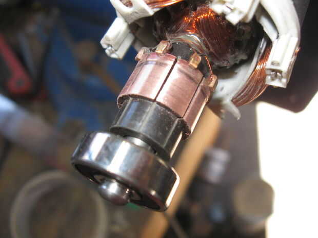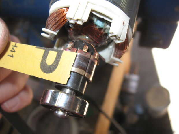 Usando un papel de lija muy fino (grano 800) limpiar y vestir el conmutador hasta que quede brillante y suave. Limpiar las líneas negras entre los segmentos del conmutador con un cepillo de latón para eliminar cualquier posibilidad de un cortocircuito.