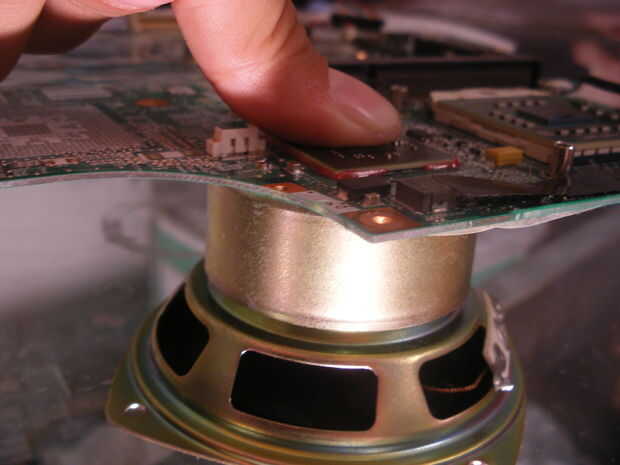 una vez que el chip y el apoyo están alineados Presione hacia abajo en el centro del chip, no tenga miedo de apretar con cierta presión, sólo no presione demasiado duro! Si está demasiado caliente entonces usar una manga de una camisa o presione y suelte rápidamente. Después de presionar hacia abajo el centro Presione el resto de la viruta, asegúrese de presionar en todas las piezas, prensa duro y rápidamente así el chip y la soldadura no se enfríe antes de que termines.